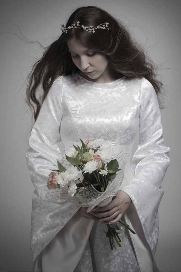Most brides who choose a Celtic wedding dress forgo the traditional veil, and instead opt for loose or braided hair intertwined with flowers, or an intricate silver headband or tiara.