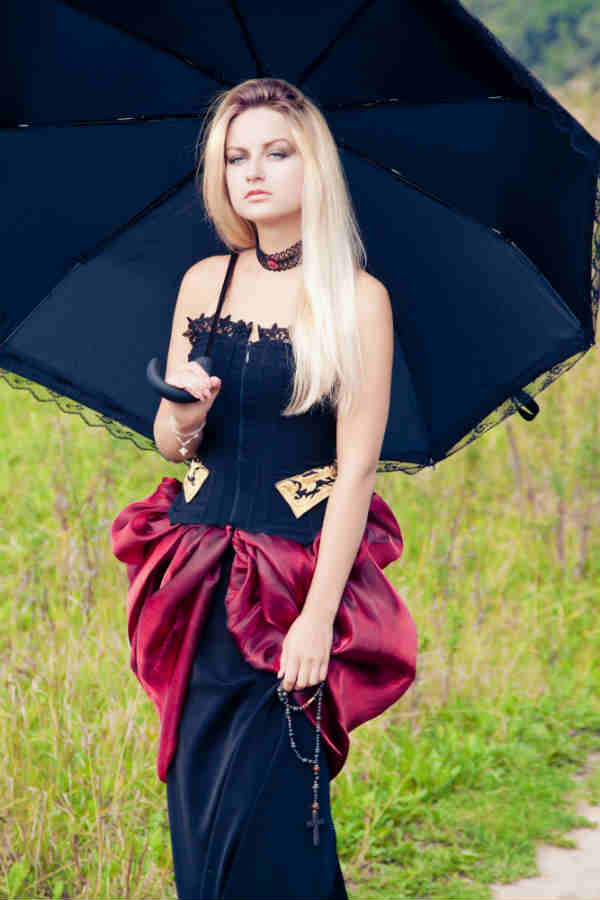 Accessorising Gothic bridal gowns can be tremendous fun. If you’re looking for a ‘vampire bride’ look, you could apply heavy eye make-up and wear a lace veil that compliments the colour of your gown. Equally eye-catching is a classic chignon teamed with a delicate tiara. When choosing your jewellery, the general rule is the older, the better, so a search of local antique stores or a plea to Grandma may well produce some earrings, rings, or necklaces which feature unusual gemstones or engravings.